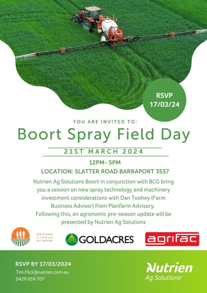 Through the BCG Young Farmer Network, BCG invites Loddon and Quambatook region farmers to attend the Sprayer Day, held by Nutrien Ag Solutions, Boort.