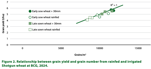 The observed treatment yield differences were primarily driven by variations in grain number, underscoring the project’s focus on crop agronomy to target the growth stages most important for grain number determination. This critical period, occurring in the 30 days prior to flowering, will be a central focus of the project to optimise management practices and maximise yield potential.