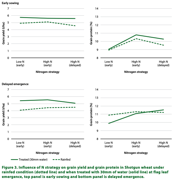 Additional water did not alter the yield response to N at either early or delayed sowing. There was limited evidence of haying-off or negative effects from high N application. Interestingly, protein levels improved, with better N recovery and higher protein and yield when extra water was applied. The lack of yield response to N suggests that N was not a major tactical lever at this site, likely due to the strong legume history meeting N demands. While applying high N rates was not economically justified in this scenario, growers can be reassured that high residual soil N and high N applications did not negatively impact yield or protein under dry spring conditions in the new cultivar.