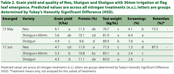Applying 30mm of water at the start of the critical period increased yield by 0.7t/ha for early sowing and 1t/ha for later sowing, without reducing protein levels. This equates to 23kg/ha/mm for early sowing and 33kg/ha/mm for later sowing, indicating that transpiration efficiency during the critical period can exceed current benchmarks.