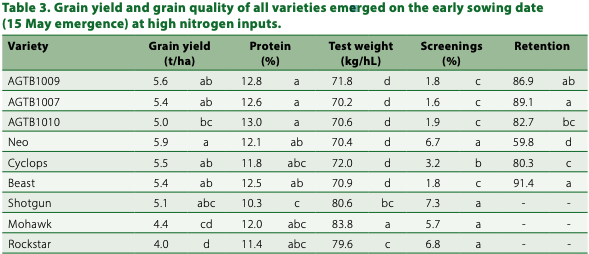 Barley yields ranged from 5t/ha to 5.9 t/ha from earlier sowing at high N; importantly new winter barleys AGTB1009 and AGTB1010 achieved similar yield to the highest yielding commercially available spring barley varieties Neo, Cyclops, and Beast (Table 3). This is an exciting step forward in genetics for earlier planting and a more than 1t/ha improvement on Mohawk (winter wheat). Shotgun performed similarly to spring barley. Grain quality parameters of most relevance were screenings which were higher in all wheats, and Neo barley.