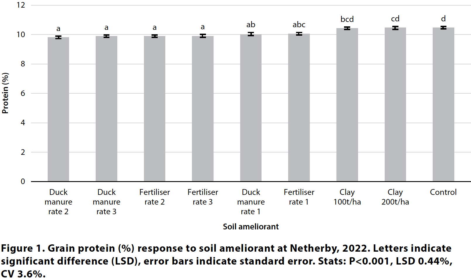 The soil amendments no longer recorded significant differences in crop establishment, biomass, yield, and grain quality parameters tested, except for grain protein. Claying and the control had significantly higher grain protein than duck manure rate 2 and 3, and balanced fertiliser treatments (Figure 1). A possible explanation is that over the years the increased yield and biomass generated from the manure and balanced fertiliser treatments caused higher demand for nitrogen from the crop. Nitrogen was not applied in-season so the crop has potentially started mining the soil of nitrogen. At the time of writing, soil test results were not available to confirm this theory.