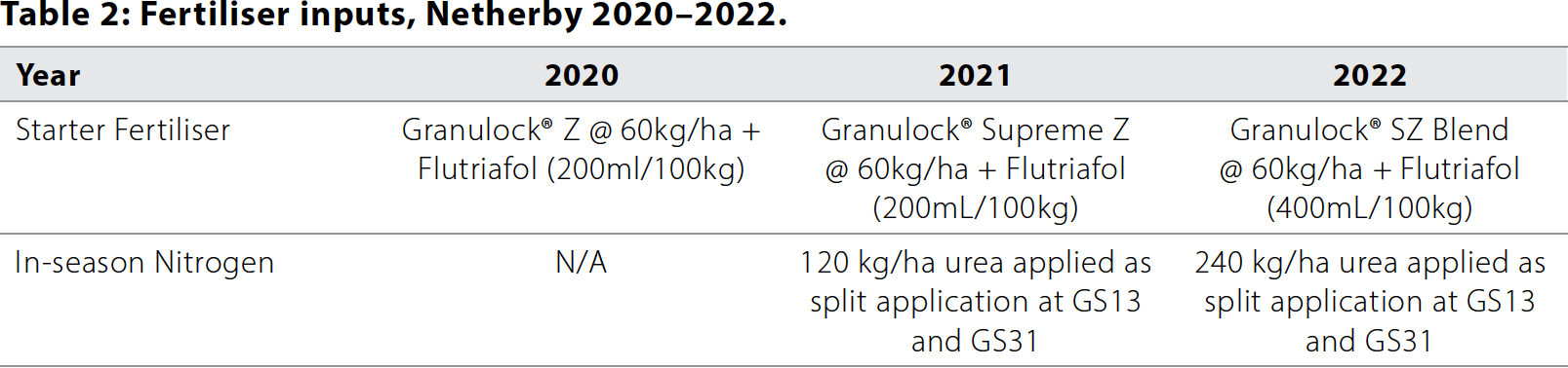 Fertiliser: Refer to Table 2