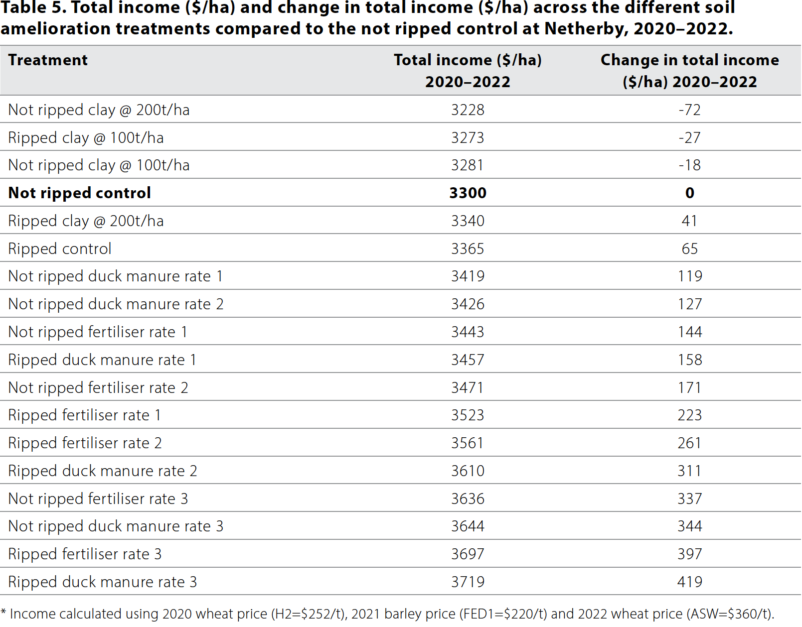 The economics of applying soil amendments and ripping in this trial are outlined in Table 3. The ripped 20t/ha duck manure and 20t/ha balanced fertiliser treatments generated the most income in this experiment (Table 5).