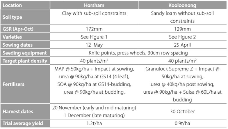Trials were sown at Horsham, Beulah and Kooloonong, each with four replicates. At Horsham, varieties were compared using a split plot design, while at Kooloonong a randomised trial design was used. Varieties at the Horsham site were grouped by their maturity, as the site had multiple harvest dates, and then randomised within (sub-plots). The canola varieties at Beulah main site did not make it to harvest due to lack of rainfall.