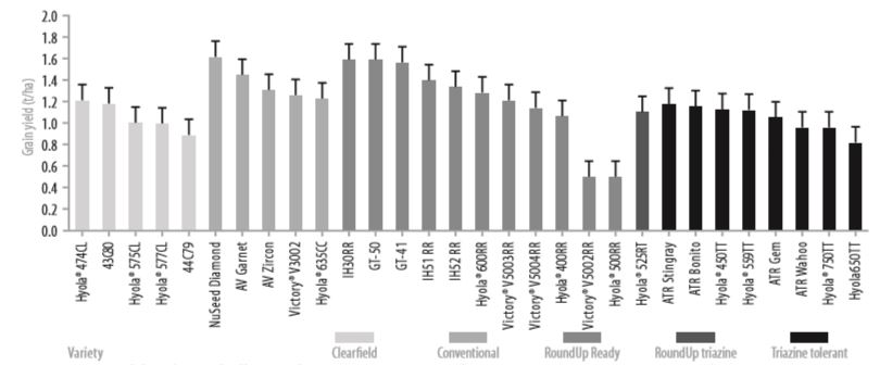 Within the RoundUp Ready varieties, IH30RR, GT50 and GT41 were the highest yielding. The triazine tolerant (TT) group had a much smaller spread between varieties, with little separating the top yielding ATR Stingray, ATR Bonito, ATR Gem, Hyola® 450TT and Hyola® 559TT.