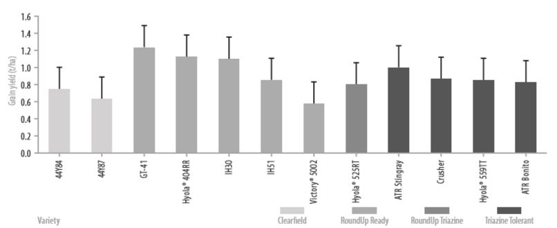- In a year with frosts, insects and very dry finish, earlier varieties yielded well, most notably those that were Roundup Ready (IH30 and GT41); Clearfield and Triazine Tolerant varieties performed comparatively poorly.