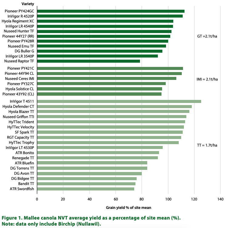 The highest yielding varieties in the Mallee region were Pioneer PY424GC (2.4t/ha), InVigor R 4520P (2.4t/ha), and Pioneer PY421C (2.4t/ha). On average, the highest performing chemical group was GT and IMI at 2.1t/ha (Figure 1).