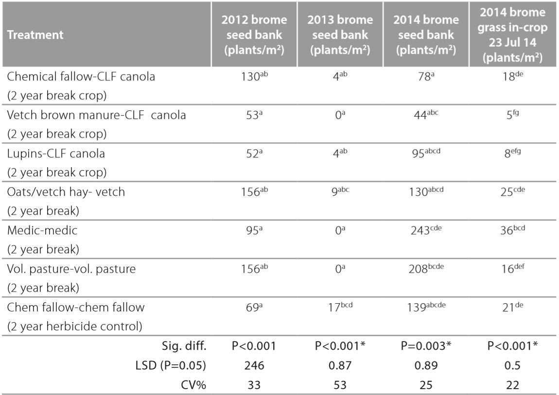 Table 3. 2012, 2013 and 2014 brome grass seed bank (plants/m2) and 2014 in-crop brome grass (plants/m2).
