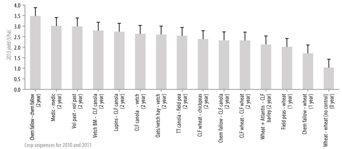 All two year break crop sequences, apart from CLF wheat-chickpeas, chemical fallow-CLF canola and CLF wheat-CLF wheat, yielded at least 1.2t/ha more than the lowest yielding treatments.