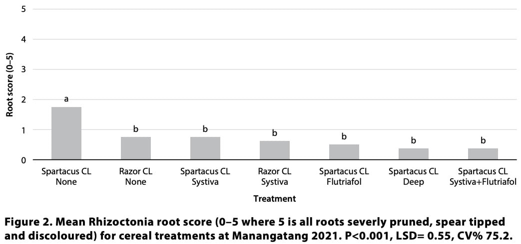 In 2021, disease symptoms were observable but insignificant at both the Birchip and Manangatang sites from visual scoring (P>0.05) (data not shown). Root scoring of plants removed from plots at the Manangatang site on 2 August 2021 found increased symptoms of Rhizoctonia root rot in Spartacus CL plots without any seed treatment or management applied compared to all other treatments. However, disease severity was still low (Figure 2).