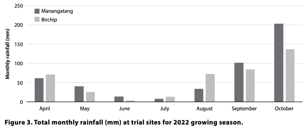 The 2022 season brought decile 10 rainfall for Birchip and highest on record growing season rainfall at Manangatang. While most GSR fell in September and October, the season started with a good break, allowing trials to be sown into moisture and establish well (Figure 3).