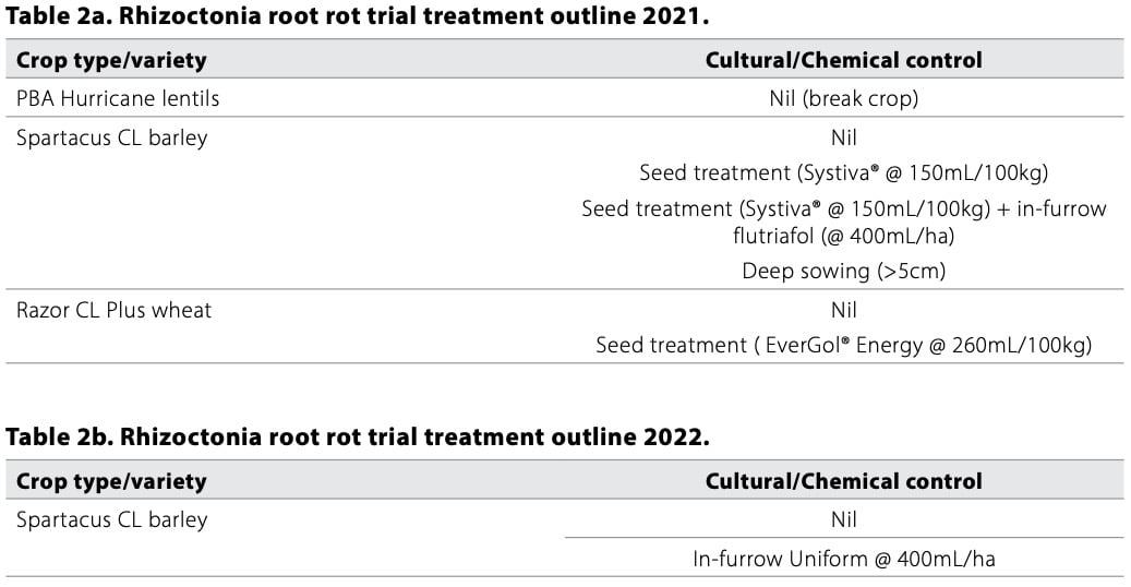 Fertiliser: Crown rot trial managed as per best practice in 2021 and as per Table 1 in 2022. Rhizoctonia trial managed as per best practice to keep nutrients a non-limiting factor across the trial period.