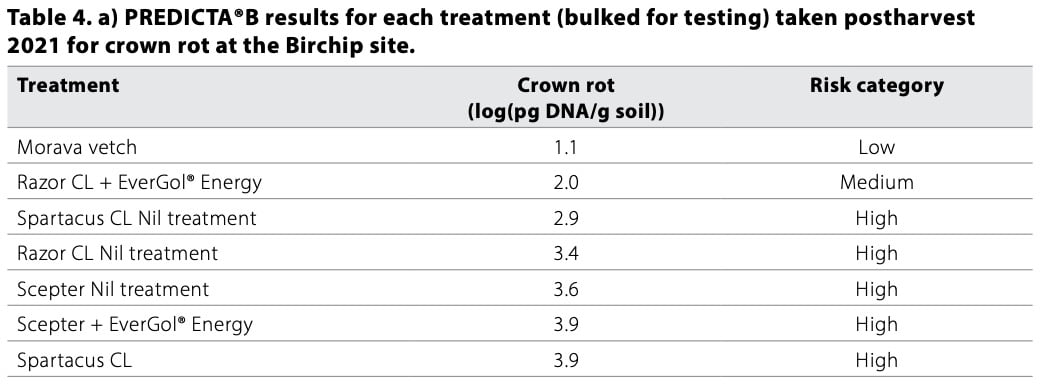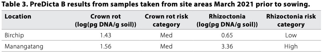 PREDICTA®B sampling in 2021 before sowing identified two paddocks appropriate for trial work with risky levels of crown rot and Rhizoctonia at their relevant sites and lower levels of other pathogens (Table 3).