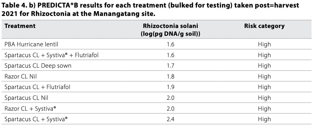 Results from the Rhizoctonia site at Manangatang suggest a general reduction in inoculum levels across treatments, however all results returned a high risk for infection. PBA Hurricane lentil treatments had one of the lowest inoculum measurements. As a non-host break crop, this was expected (Table 4b). Overall inoculum level reduction at the site may have been due to seasonal conditions.