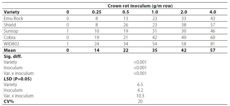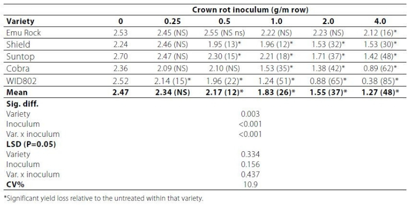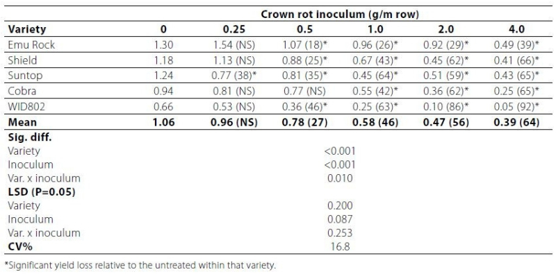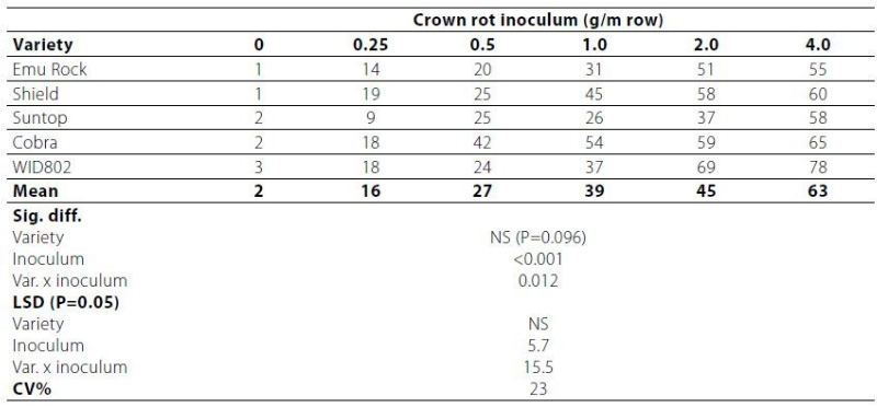 - Crown rot yield losses were related to the inoculum level present at planting and were exacerbated by the dry finish to the season.