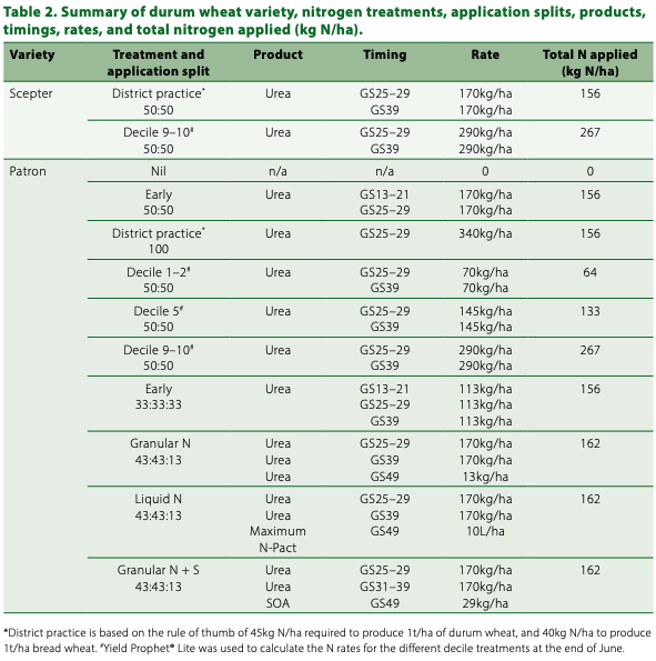 In the durum NVT trial 220kg/ha of urea was applied as a split application (100kg/ha on 28 July (GS14), 60kg/ha on 31 July (GS21) and 60kg/ha on 14 August (GS31)).