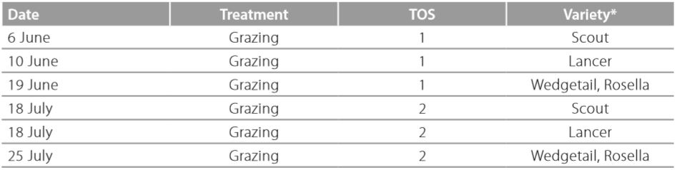 Oat seeds were spread over the plots at a density of 25 seeds/m² prior to sowing to simulate the presence of weeds. Grazing occurred on plots specific to variety growth stage (Table 2). Grazing was mechanically simulated using a line trimmer.