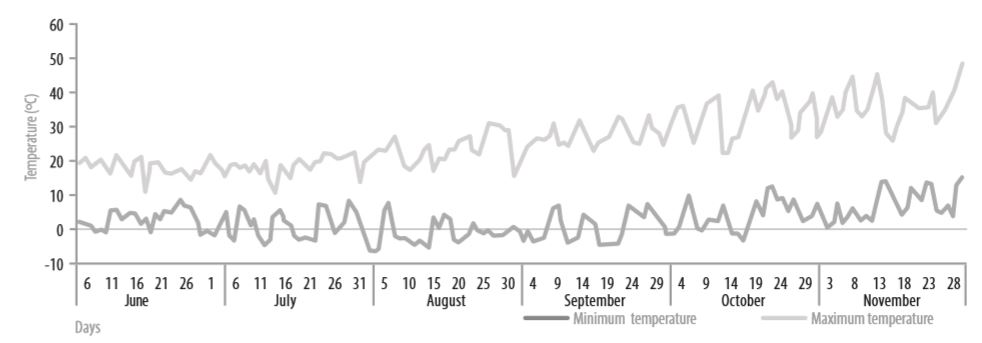 Figure 1. Temperatures recorded from 6 June until the end of the November at Quambatook.