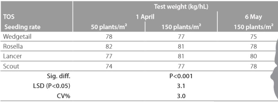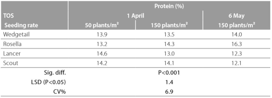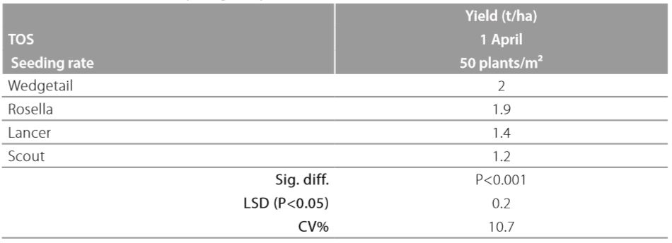 - Winter wheat cultivars Wedgetail and Rosella sown on 1 April were higher yielding than LRPB Scout sown on 6 May.