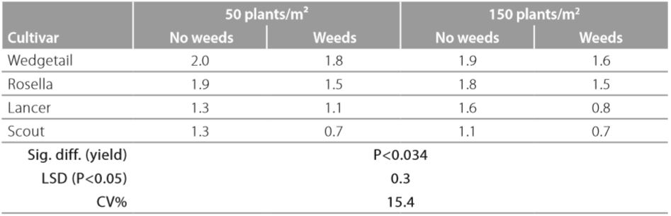 Sowing slow maturing cultivars such as Wedgetail at low plant density (50 plants/m²) did not decrease their competitive capacity. The percentage yield loss was the same in Wedgetail and Rosella wether sown at 50 or 150 plants/m2. Winter wheats (Wedgetail and Rosella) were much more competitive than Scout, but some of this effect was probably due to the stem frost damage sustained by Scout at the early time of sowing (Table 7).