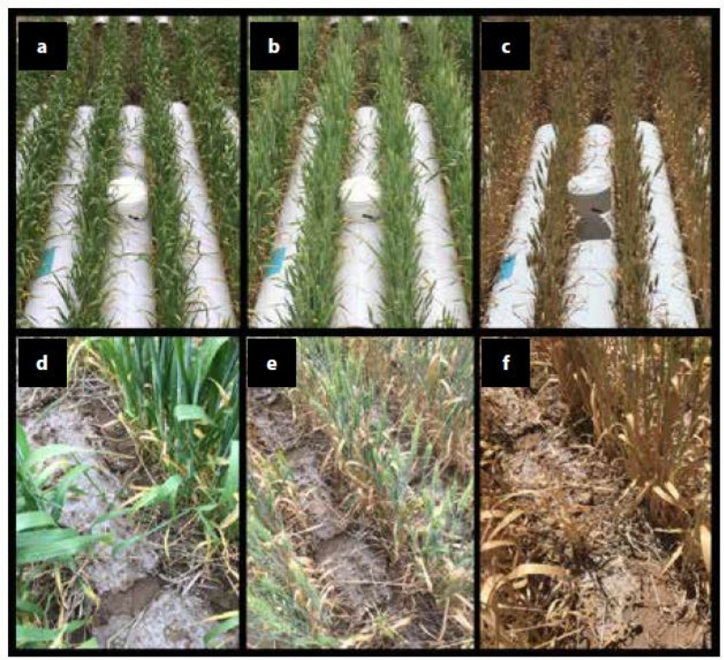 Figure 1. Inter-row evaporative protection methods, PVC (a, b & c) and spray-on polymer (d, e & f), for Scepter wheat at mid-tillering, (a & d); heading, (b & e) and maturity (c & f).