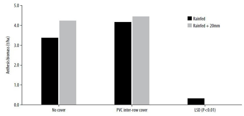 Where inter-row PVC cover was imposed at mid-tillering for LW crops, anthesis biomass was equivalent to where crops had an additional 20mm of irrigation applied at mid-tillering and were uncovered (Figure 2). Moreover, for crops with inter-row cover, growth was equivalent across water treatments (4.3t/ha), whereas for those crops with no cover, irrigation increased anthesis biomass by 26%. Evidently greatest benefit of inter-row cover on crop growth occurred under drier conditions.