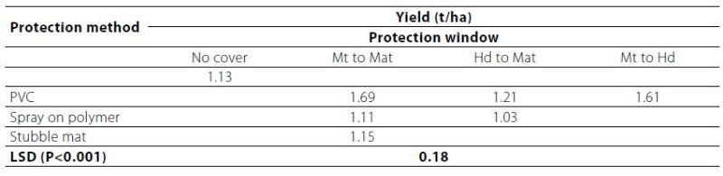 The nil and PVC cover treatments were in a factorial combination with protection window and growing season water treatments, whereas the spray on polymer and straw treatments were applied across both water regimes, but to a restricted set of protection windows.