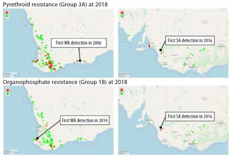 Repeated insecticide applications of the same MoA group within and between seasons has led to the relatively rapid evolution and spread of resistance, which now includes the two main chemical groups: synthetic pyrethroids (synthetic pyrethroids, Group 3A) and organophosphates (organophosphates, Group 1B). Both are routinely applied against this pest in both the grains and grazing industries.