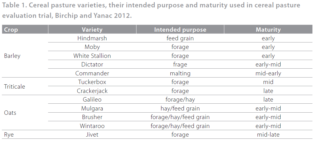 In 2012, the better performing forage wheat, triticale, barley and oat varieties from a similar trial conducted at Corack in 2011 were re-evaluated, using a replicated plot trial at Birchip and Yanac (NW of Nhill). The trial at Birchip was sown into wheat stubble, while at Yanac the trial was established on a cultivated fallow.