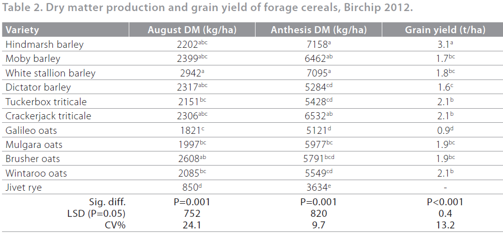 At Birchip, DM production was greatest in August and at anthesis for the early maturing varieties Hindmarsh, Moby and White Stallion barley, but also for late-maturing Crackerjack triticale (Table 2). Dictator barley and Brusher oats performed well early, but were surpassed in DM production by anthesis.
