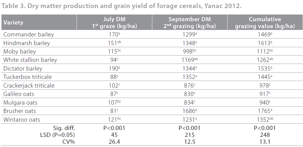 At Yanac, Commander, Hindmarsh and Dictator barley produced the most early dry matter. White Stallion barley, Tuckerbox triticale, Brusher and Wintaroo oats started slowly, but managed by September to accumulate grazing value comparable with the other faster growing varieties. Moby barley and Crackerjack triticale did not do as well at this site as at the Birchip site (Table 3). Galileo again was one of the lowest DM producing varieties.