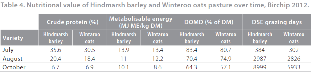 All varieties provided the minimum requirements for lactating ewes and lambs when grazed in July and August, ie. crude protein >16%, metabolisable energy >11 MJ/kg DM and digestibility >75%. Table 4 demonstrates the decline in nutritional value of two cereal pastures as the season progressed and how this, combined with dry matter production, affects the grazing value (DSE grazing days) between the varieties.