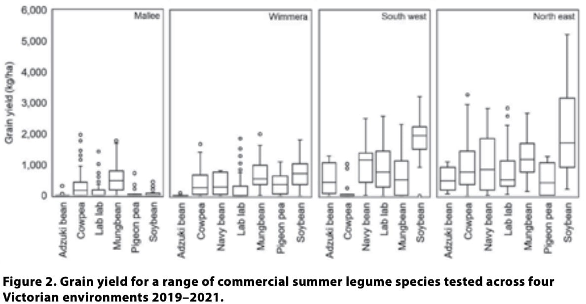 For north east Victoria, soybean with median yields of 3.121t/ha and mungbean (1.075t/ha) were the highest yielding of the species. Pigeon pea was the lowest yielding (Figure 2). For south west Victoria, soybean was also high yielding, with median yield of 1.856t/ha. Mungbean (0.82t/ha) and navy bean (1.183t/ha) also yielded moderately well. Despite cowpea producing modest biomass in this environment, it did not translate to yield, which is likely related to limited flowering and seed set. In the Wimmera, median yield of all species was less than 1t/ha. The highest yielding species were soybean (0.701t/ha) and mungbean (0.542t/ha). In the Mallee, mungbean was the highest yielding species (0.453t/ha) and soybean and pigeon pea did not yield. Overall, the trend of summer legume yields across environments was Mallee < Wimmera < south west < north east.