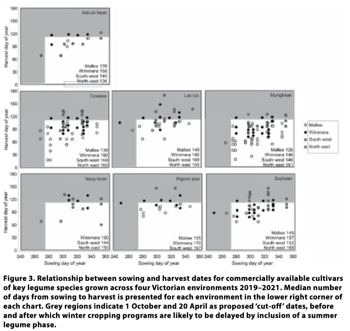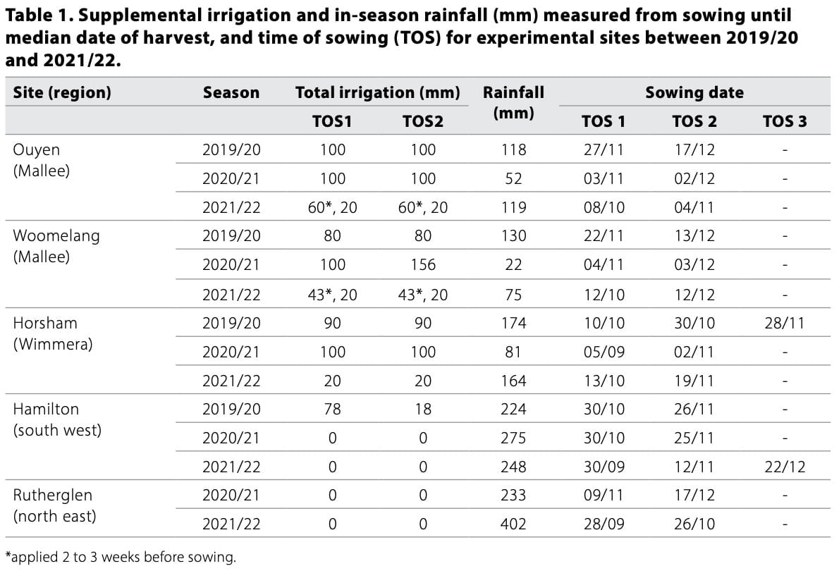 The experimental program was conducted over three consecutive summer seasons (2019/20 to 2021/22) and evaluated the viability of a broad range of alternative legume species within Victoria. The species were adzuki bean, cowpea, lab lab, mungbean, pigeon pea, navy bean, and soybean. At each location, crop response across species and variety combination were compared for different times of sowing. Trials were a complete randomised block design replicated three times. Supplemental irrigation equivalent to 20mm at sowing was applied to simulate a break opportunity. In the drier environments follow-up water was scheduled at key times to alleviate terminal water stress and provide a realistic yield potential (Table 1).