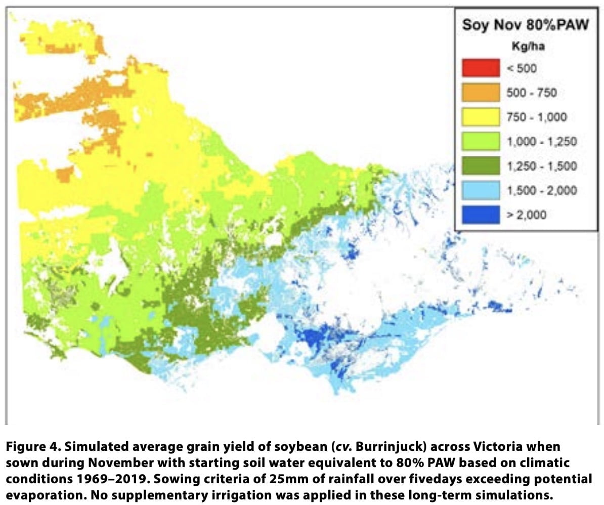 In addition to regionally-specific data observed through the experimental program, the long-term production potential of summer legumes in south east Australia was assessed with biophysical modelling. This included mapping long-term simulated yield of soybean and mungbean to identify zones most suited to their production. There is a trend of higher yield potential in the high rainfall regions of north east and south west Victoria for soybean (Figure 4). In these regions, average soybean yield was 1–1.5t/ha when a November sowing opportunity occurred (about 70 per cent of years) and stored soil water at sowing was at 80 per cent of plant available water (PAW). In contrast, for low rainfall regions such as the Mallee, expected average yields were 0.5–0.75t/ha where sowing opportunities occurred (about 60 per cent of years). Under conditions of lower stored soil water, expected yields decreased in a spatial pattern broadly following rainfall gradients in a south east direction. Experimentally, we also determined that summer crops grown in drier environments caused a yield penalty to the following winter crop. For every tonne of summer legume biomass there was a wheat yield penalty of 0.4–0.5t/ha