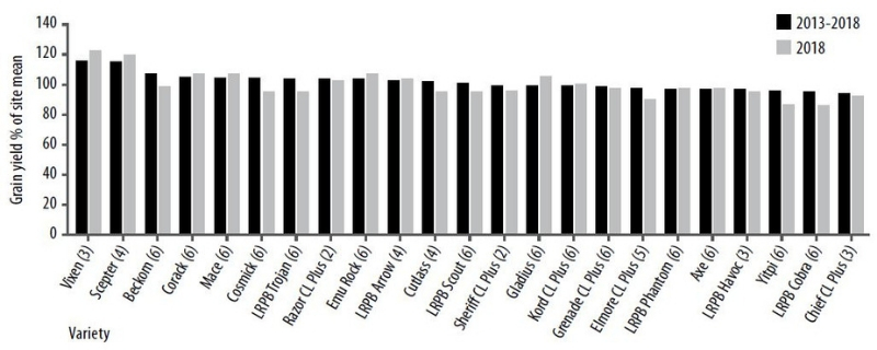 Figure 1. Mallee wheat NVT average wheat yield as a per cent (%) site mean from 2013-2018 for 23 varieties. Number in brackets denotes number of years out of past six seasons it has been in NVT. Note: 2018 data only includes Birchip, Merrinee, Quambatook and Ultima sites.