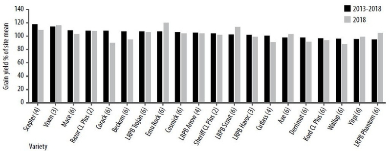 Emu Rock, Vixen, LRPB Scout, Scepter and Razor CL Plus were the top yielding varieties in