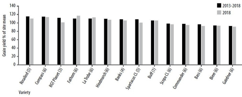 The top five varieties were Fathom, Compass, LaTrobe, Rosalind and Hindmarsh, all producing 107 per cent (%) or higher than the site mean (Figure 3). Fathom was impressive across several sites, and was considerably higher than long-term averages, suggesting it handled the seasonal conditions well. Most others were on par with their long-term performance.