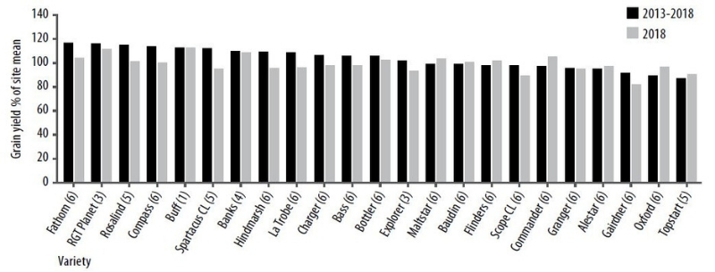 Figure 4. Wimmera NVT average barley yield as a per cent (%) site mean from 2013-2018 for 23 varieties. Number in brackets denotes number of years out of past six seasons it has been in NVT. Note: 2018 data includes Charlton, Brim, Horsham and Kaniva sites.