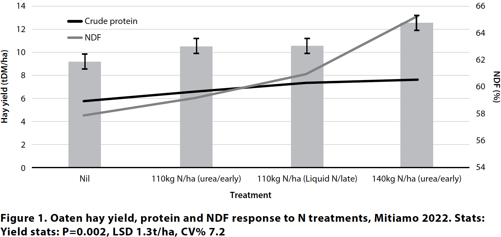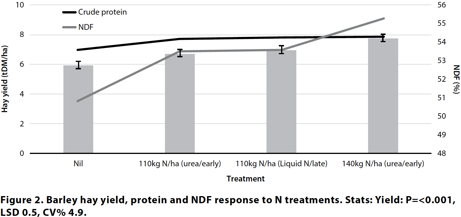 - Hay yield responded by 1.7–2t/ha to an additional 30kg N/ha of nitrogen applied in-crop.