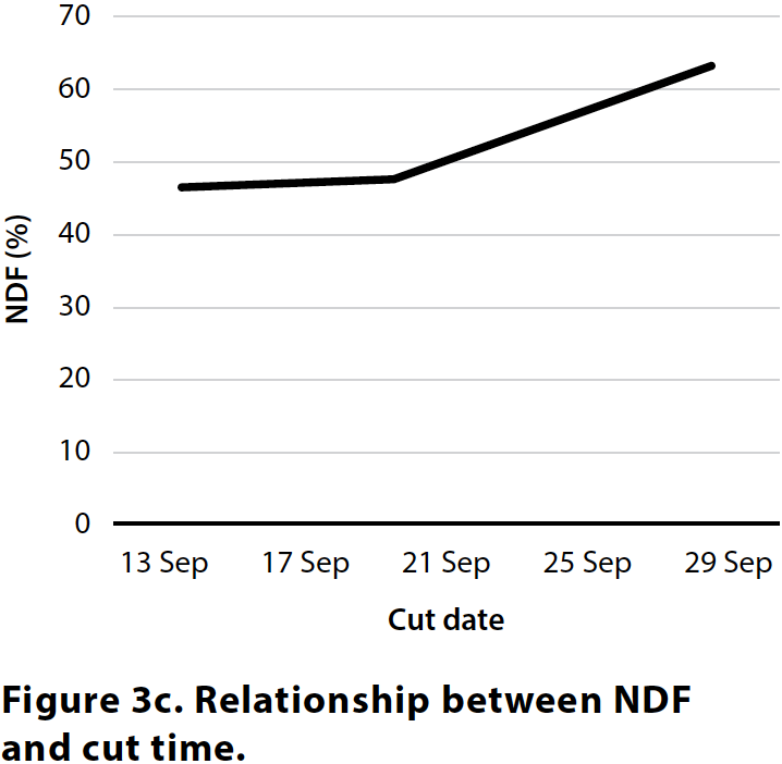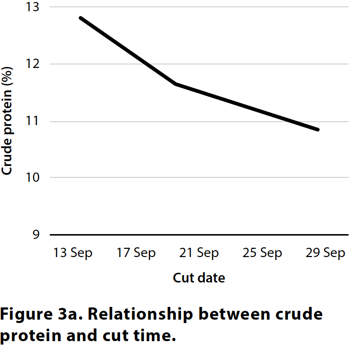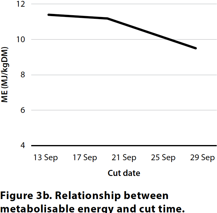 A subset of varieties was cut early at GS45 (13 Sep), GS51 (19 Sep) and GS55 (28 Sep) to assess differences in yield and quality at earlier crop maturity. As the crops matured, yield increased but quality decreased. Over the 15-day period between earliest and latest cut date, CP decreased by 2 per cent and ME fell by 2MJ/kg DM, while NDF increased by 17 per cent, demonstrating the relationship between maturity and declining quality (Figure 3a, 3b, 3c, 3d).