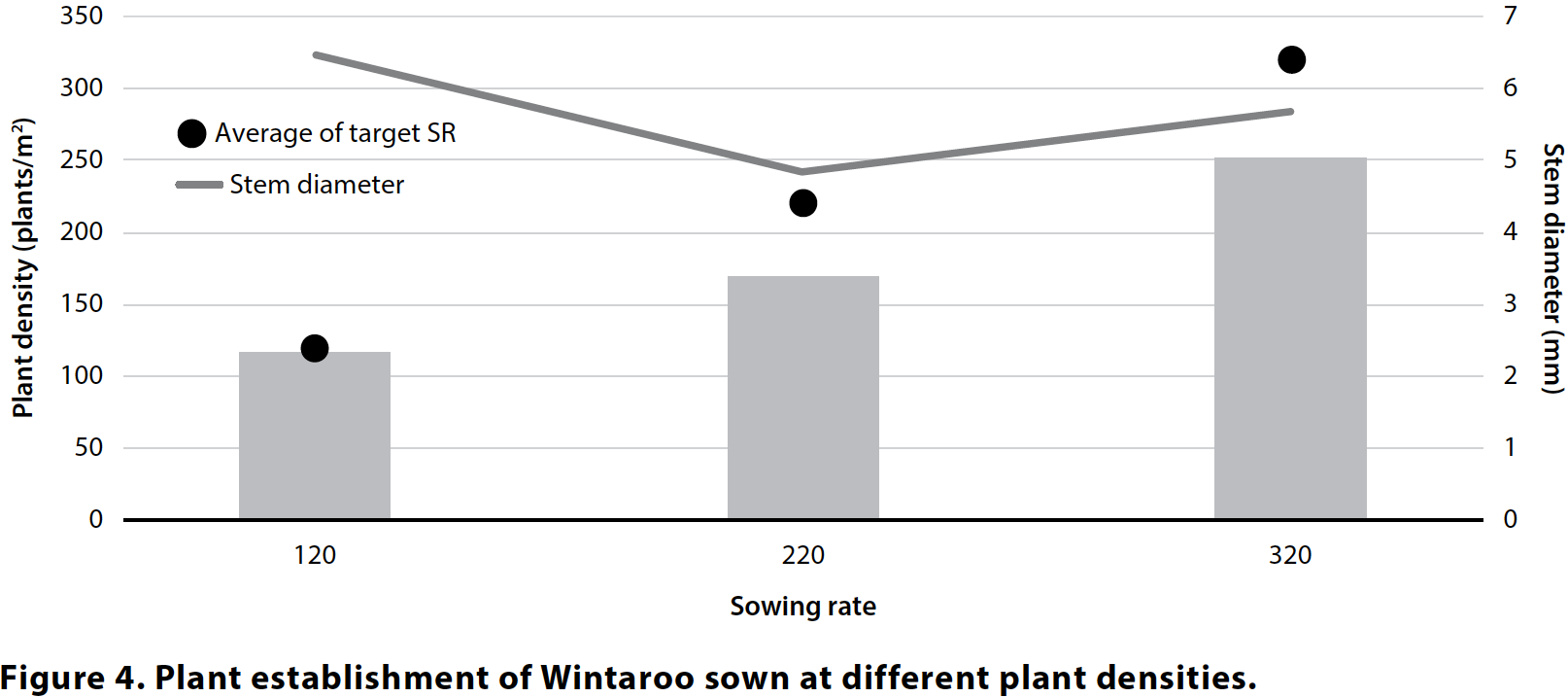 Three sowing rates of Wintaroo were sown in this trial: best practice for growing cereal hay 320 plants/m2 and lower sowing rates of 220 plants/m2 (standard plant density for grain) and 120 plants/m2. Plant establishment was achieved for the lowest sowing rate, but did not reach target plant densities for the two higher sowing rates (Figure 4).