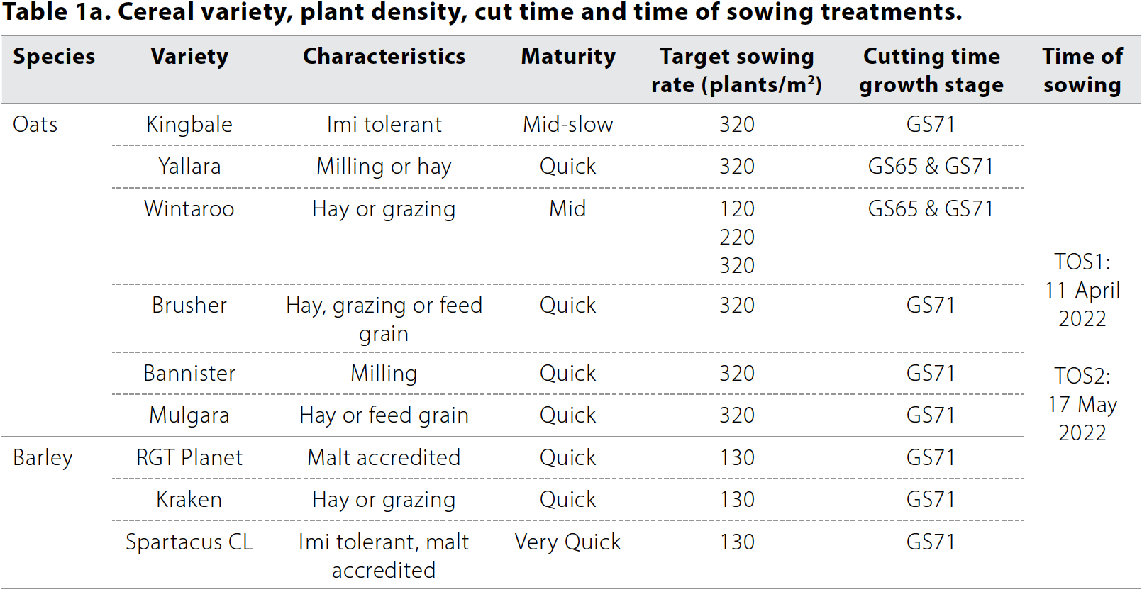 - Variety and TOS, sowing rate and time of cutting treatments: Sown with Granulock Supreme Z @ 60kg/ha and 120kg/ha of urea broadcast at GS30.
