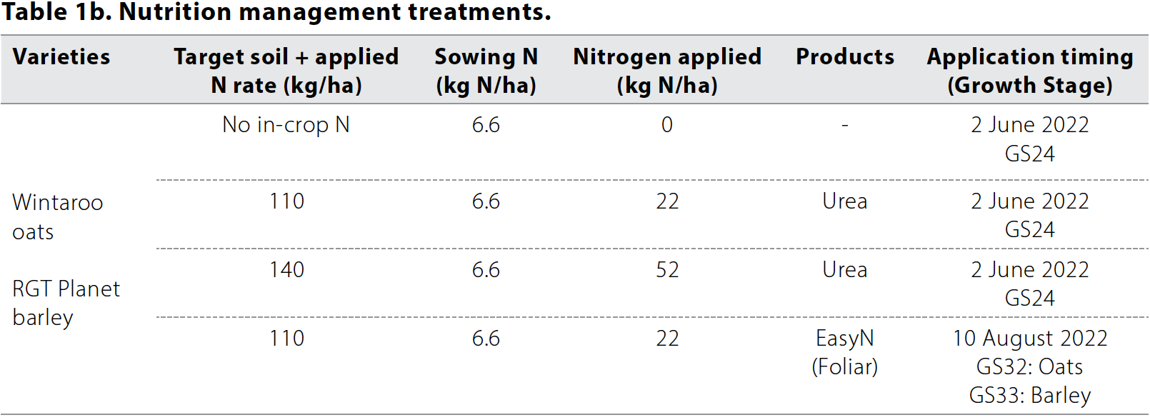 - Nutrition management: Sown with Granulock Supreme Z @ 60kg/ha. Additional nitrogen (N) was broadcast in-season as urea and liquid N as a foliar spray according to treatment (Table 1b).