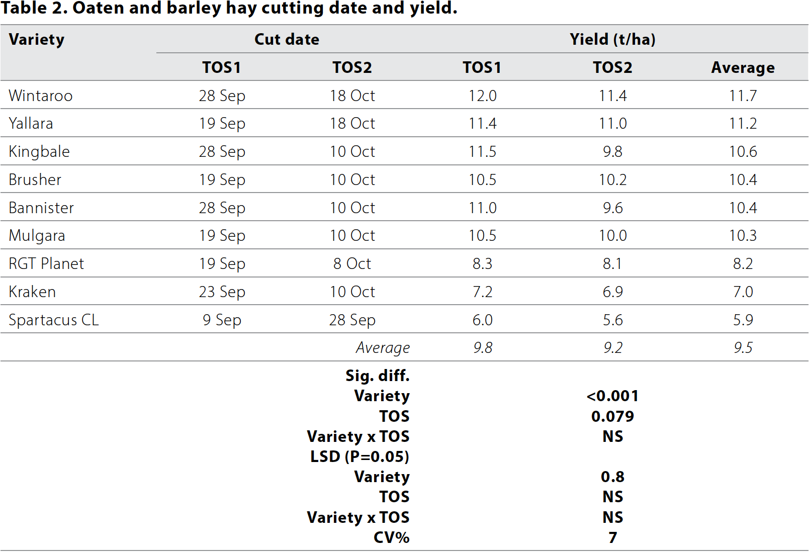 Oaten hay yielded higher than barley hay, but barley hay had better quality. End use must be kept in mind when choosing a crop type or variety. Wintaroo and Kingbale consistently yield well but were higher in fibre and lower in protein. This is suitable for maintenance of dry stock, but other varieties offer higher nutrient value for driving animal production. Barley hay, particularly RGT Planet, had the best quality in the trial.