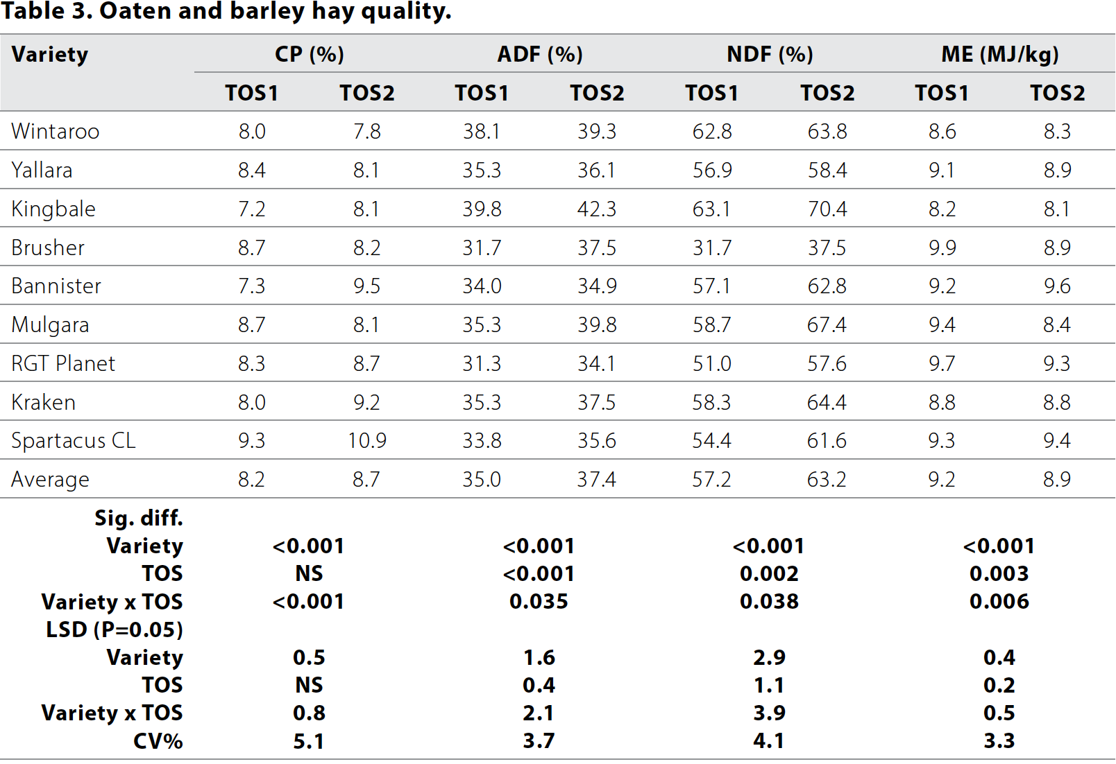 Feed test analysis measured differences in quality by variety and TOS (Table 3).