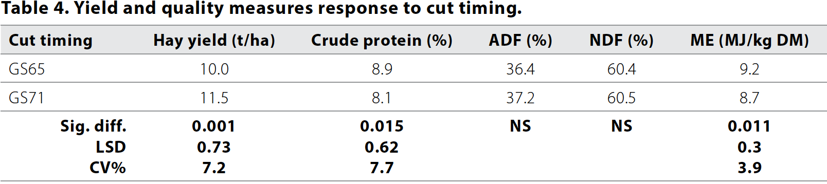- When weather allows, timely cutting of hay crops between head emergence and watery ripe maximises biomass and minimises curing time before hay quality declines.