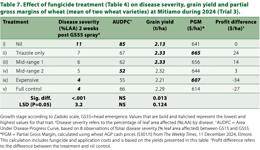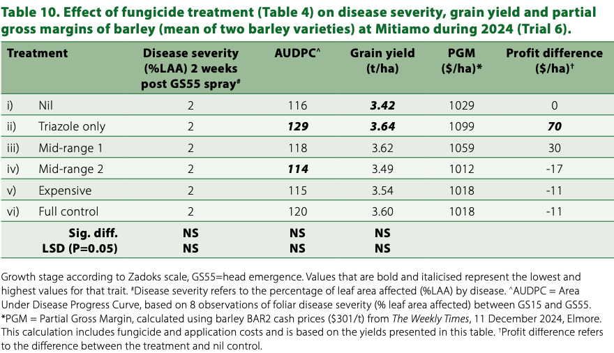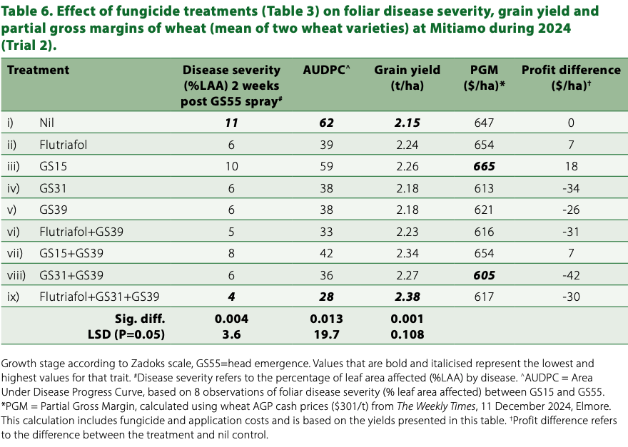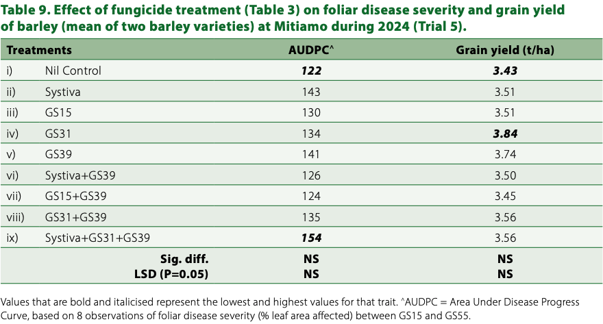 Disease development in this trial was limited, with no significant treatment effects observed on disease severity (AUDPC) or grain yield (Table 9). These findings suggest that during dry seasons with low disease pressure, in-crop fungicide applications are not warranted.