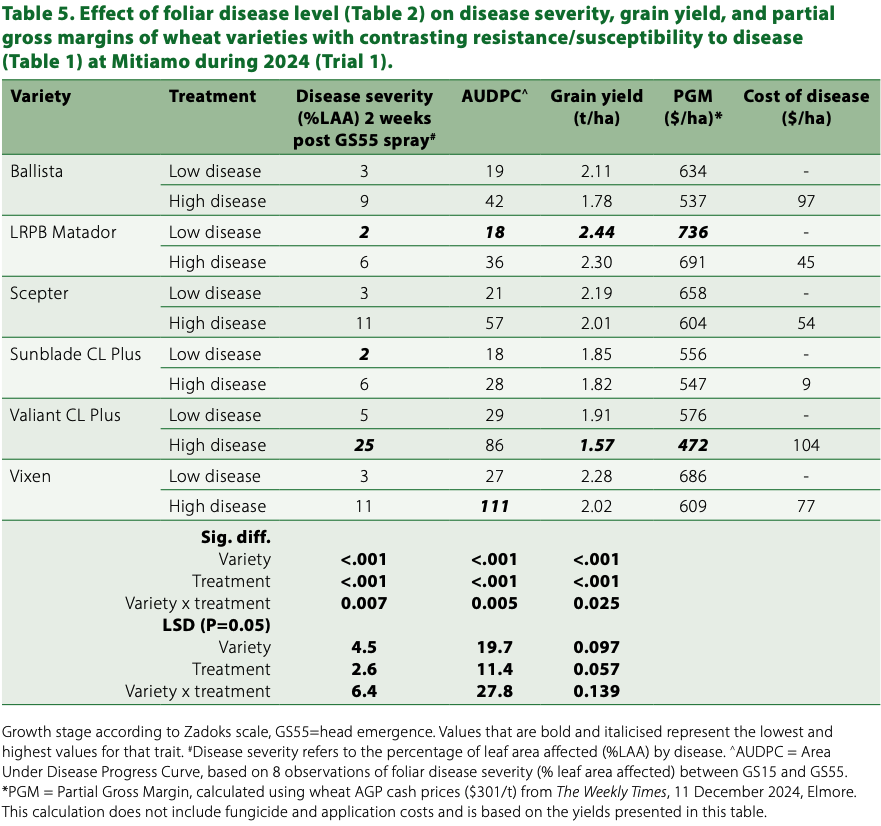 Significant variation was observed in disease severity (both post GS55 and AUDPC) between varieties and treatments (Table 5). Low disease treatments consistently had lower disease (p<.001) and AUDPC (p<.001) compared to high disease treatments, with the largest differences observed in highly susceptible varieties such as Valiant CL Plus and Vixen. Valiant CL Plus exhibited a high AUDPC (86) and disease severity (25 per cent) under high disease treatments, resulting in a substantial cost of disease ($104/ha) (Table 5). In contrast, Sunblade CL Plus, which is less commonly grown in this region and has a moderate resistance rating (MRMS), showed low AUDPC and minimal cost of disease, indicating strong alignment with its resistance profile. These findings reinforce the importance of variety choice in building strategies for disease suppression, even in dry seasons.